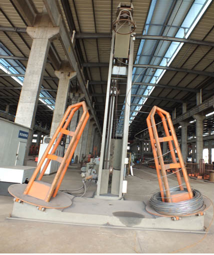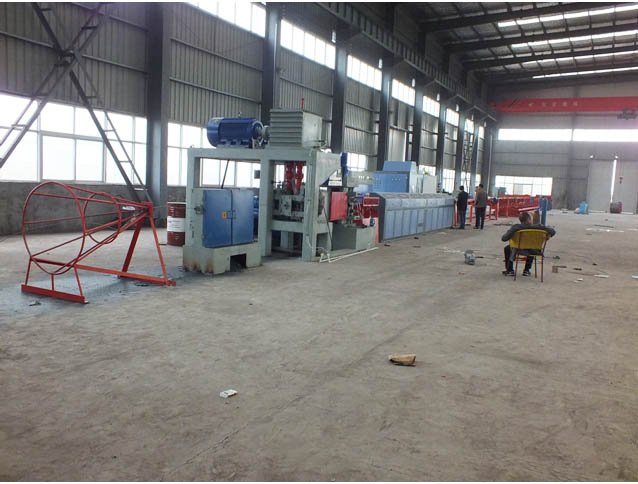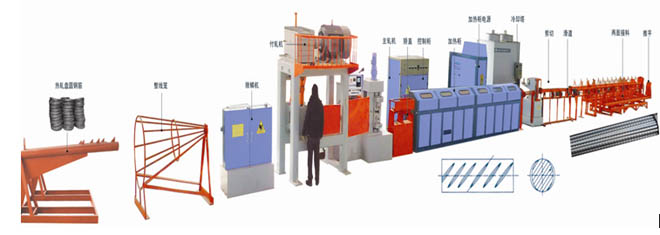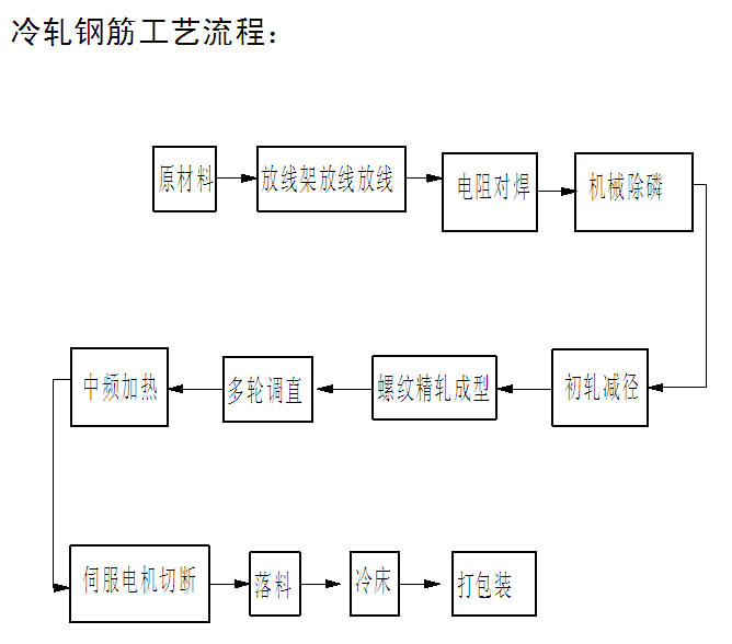 1、工藝簡(jiǎn)介 本機(jī)組是用于生產(chǎn)冷軋二面帶肋鋼筋的專(zhuān)用設(shè)備,該套生產(chǎn)線可將Φ12-Φ14mm的Q235、300熱軋盤(pán)圓鋼筋(圖1),冷軋制成兩面有月牙的帶肋鋼筋(圖2) 圖1盤(pán)圓 圖2二面帶肋鋼筋 全套設(shè)備由放線架、整線籠、除鱗機(jī)、付軋機(jī)、主軋機(jī)、矯直、加熱、測(cè)溫、剪切、滑道、兩面接料、氣動(dòng)自動(dòng)推平、收線機(jī)等組成。機(jī)組按連續(xù)工作制設(shè)計(jì),整套設(shè)備由PLC+觸摸屏系統(tǒng)控制。 下面是各組成部分結(jié)構(gòu)及性能的簡(jiǎn)單描述: (1)放線架 放線架的作用是保證該機(jī)組的高速運(yùn)行,立式放線架(缺點(diǎn)是放線灰塵比炮筒式要大),一個(gè)是工作架,另一個(gè)是備儲(chǔ)架,當(dāng)一個(gè)在放線時(shí)可對(duì)另外一個(gè)料架進(jìn)行預(yù)裝料。當(dāng)工作架上的盤(pán)圓放完時(shí),將該卷盤(pán)圓的尾端與另備儲(chǔ)架上盤(pán)圓的頭端對(duì)焊打磨后,可繼續(xù)開(kāi)機(jī),可提高因停機(jī)后裝料而降低工作效率。