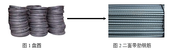 1、機組配置及性能簡述 本機組是用于生產(chǎn)冷軋二面帶肋鋼筋的專用設備,該套生產(chǎn)線可將Φ6.5-Φ14mm的Q235熱軋盤圓鋼筋(圖1),冷軋制成兩面有月牙的帶肋鋼筋(圖2)。