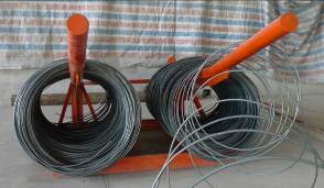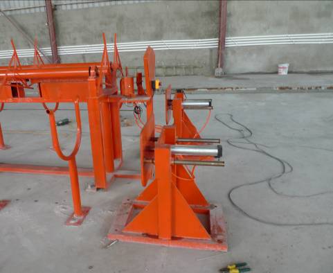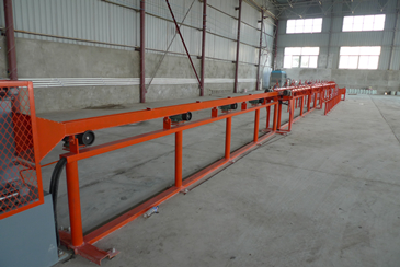 下面是各組成部分結(jié)構(gòu)及性能的簡單描述: (1)放線架(見上總圖) 放線架的作用是保證該機組的高速運行,其由雙放線炮管組成,一個是工作架,另一個是備儲架,當一個在放線時可對另外一個炮管進行預裝料。當工作架上的盤圓放完時,將該卷盤圓的尾端與另備儲架上盤圓的頭端對焊打磨后,可繼續(xù)開機,此時可對另一個放線架進行預裝料,這種預裝料設計理念可提高因停機后裝料而降低工作效率。